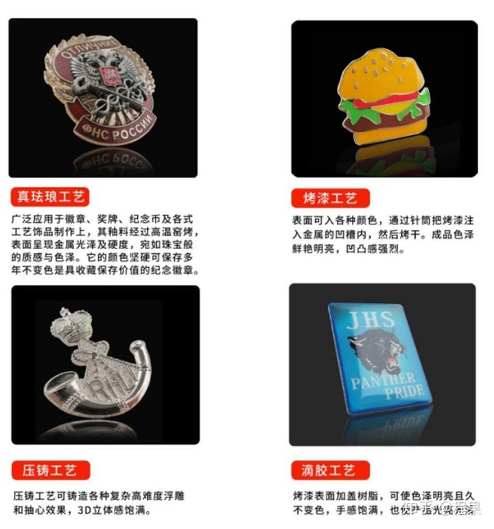 琺琅徽章:琺琅徽章又稱景泰藍徽章,屬於高檔的徽章工藝。材料主要是紅銅,用琺琅粉上色(sè)。製作琺琅徽章的特點要先上色後再磨石拋光電鍍,所以(yǐ)摸起來光滑平整。顏色均偏暗單一,可長久保存,但是琺(fà)琅(láng)易碎,不能重力敲擊或摔落。琺琅徽章常見於(yú)軍(jun1)隊的獎章,勳章,紀念章,車牌車標(biāo)等。
